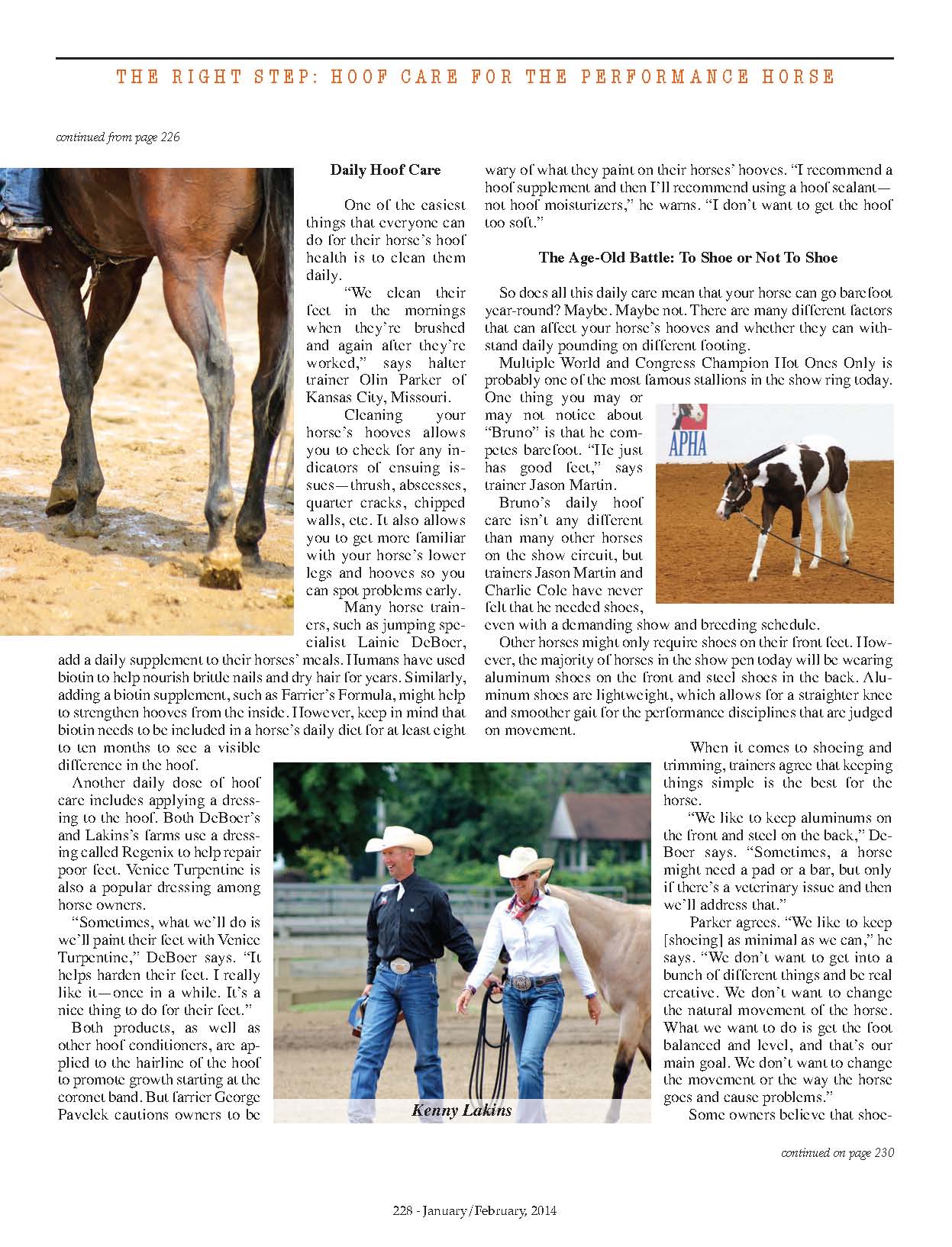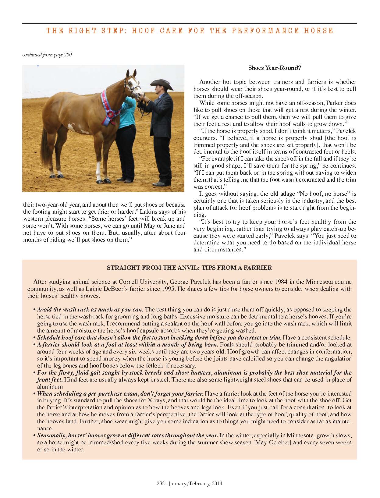 I spoke with some of the top trainers in halter, Western pleasure, jumping, and all-around to see how they care for their horses’ feet, as well as farrier George Pavelek, who has shod some of the top hunt horses in his area. They all shared their tips and experiences with shoes and bare feet in the January/February 2014 issue of the Equine Chronicle: