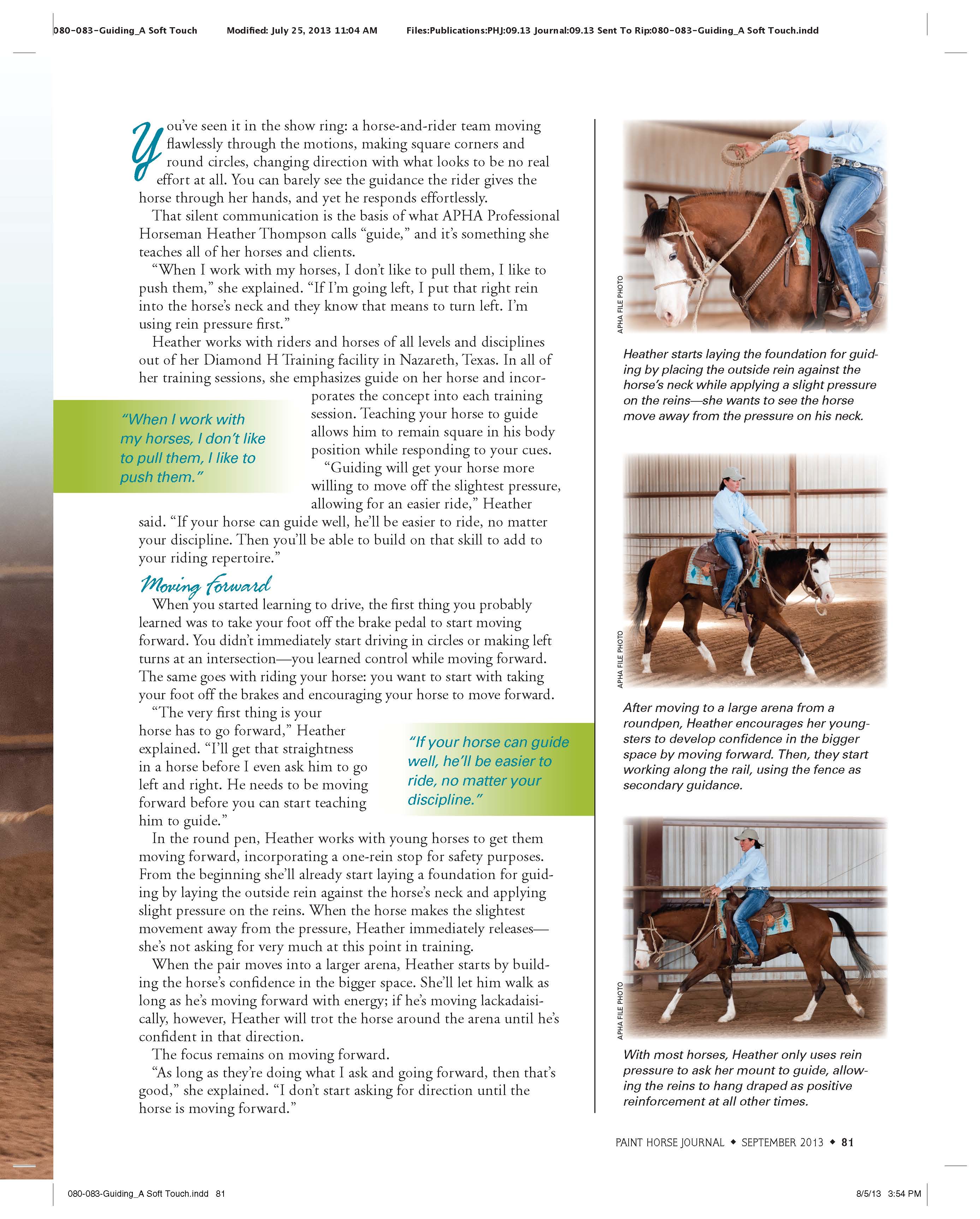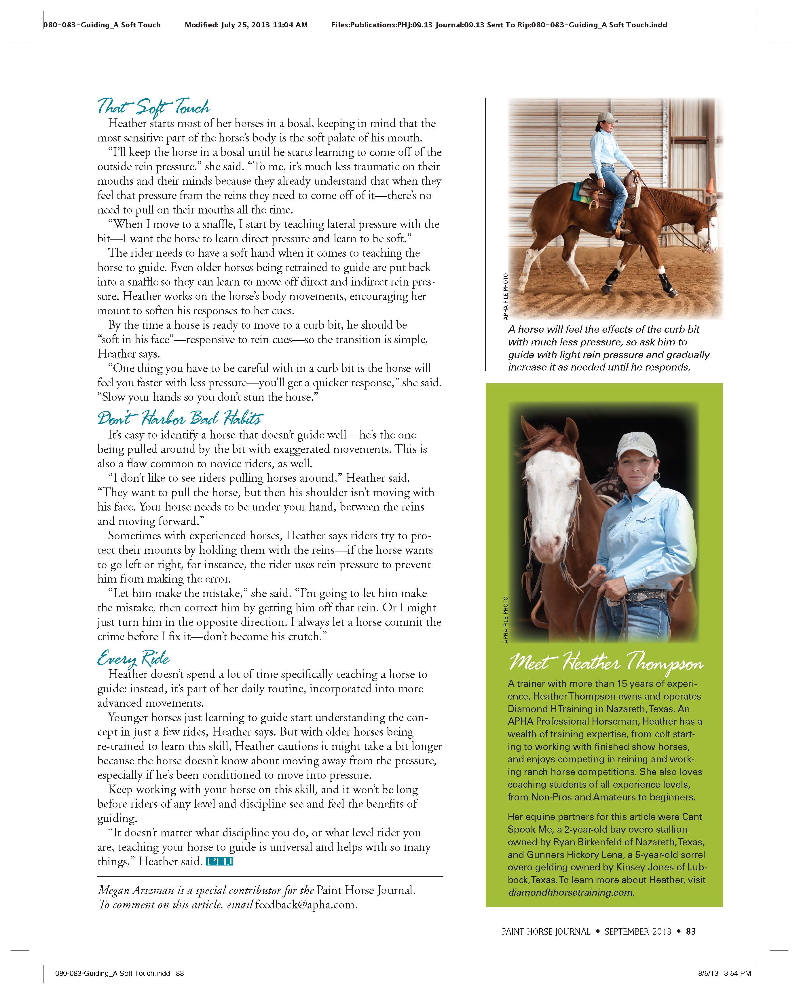 That silent communication is the basis of what American Paint Horse Association Professional Horseman Heather Thompson calls “guide,” and it’s something she teaches all of her horses and clients.