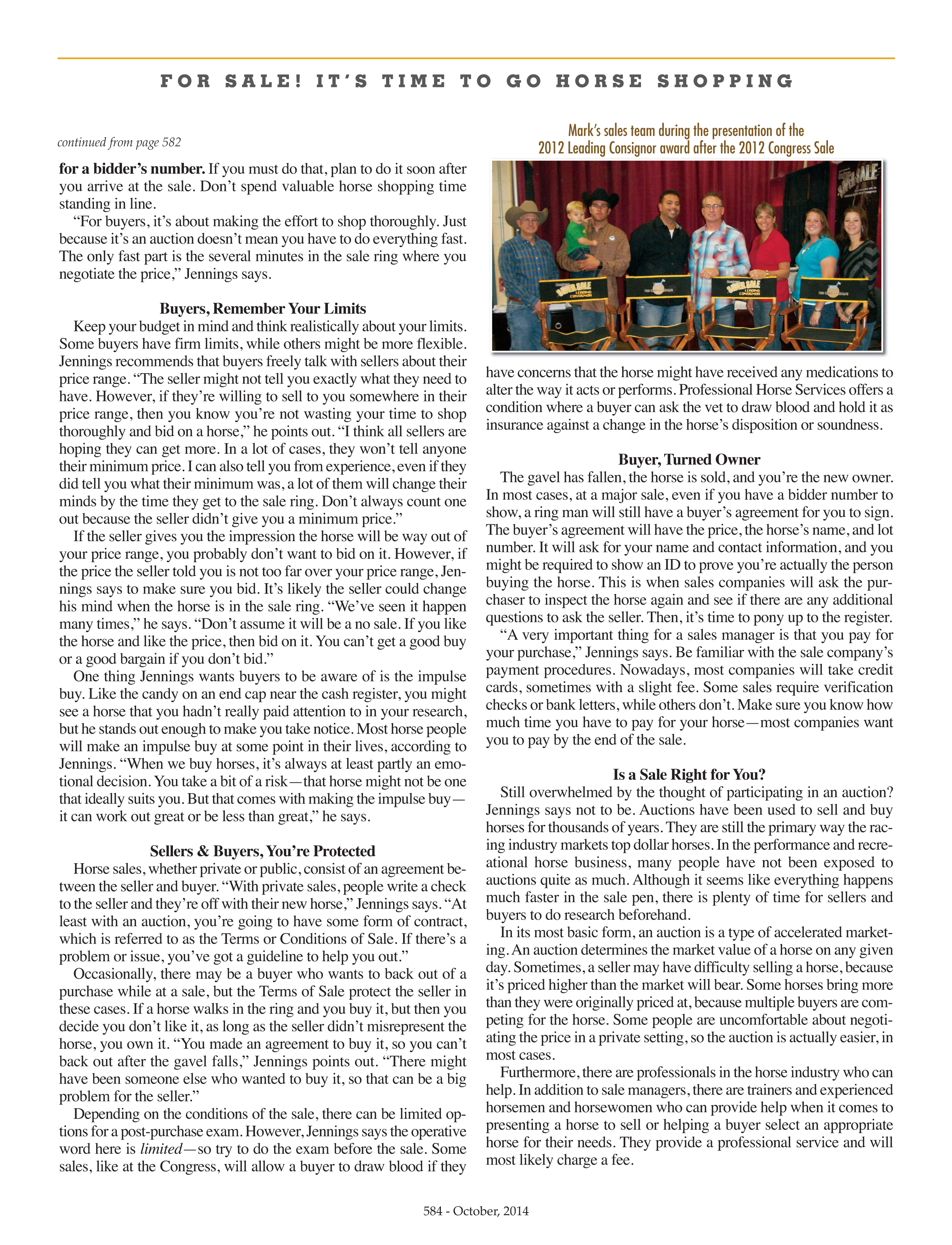 The winter months usually see an influx of horses for sale for multiple reasons–end of the show season, trying to shrink the number of stalls to care for in the winter, or just ready for something new. Not only are sales popular across the country, but the advent of online auctions is growing in popularity because of the ease of accessibility. I worked with sales professionals and trainers to help you be more prepared to hit the sales ring/website whether you’re looking to buy that next World Champion or sell your project horse for the October 2014 Equine Chronicle.